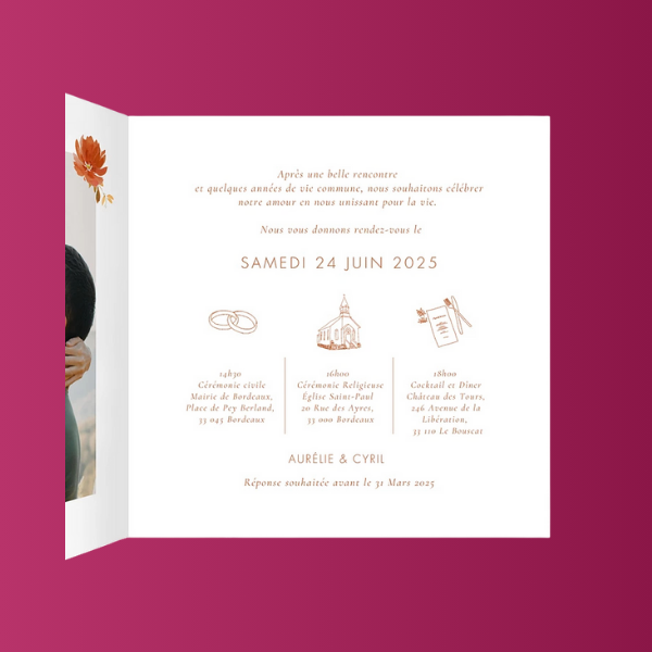 En résumé, si vous êtes à la recherche d’un faire-part de mariage unique et personnalisé, je suis là pour vous accompagner dans cette aventure. N’hésitez pas à me contacter pour plus d’informations et pour commencer à concrétiser vos idées. Ensemble, célébrons votre amour avec style et originalité !